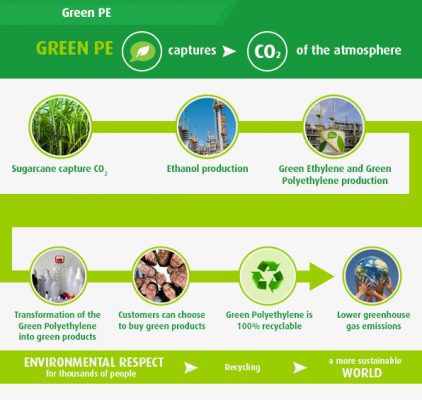 Polietylen “I’m green TM” jest wytwarzany z trzciny cukrowej, która jest surowcem odnawialnym. Można go sadzić i zbierać co roku, co czyni go dobrym źródłem do produkcji plastiku, zamiast polegać na ograniczonych źródłach ropy naftowej. Trzcina cukrowa jest w stanie pochłaniać CO2 podczas swojej uprawy, więc w ten sposób produkcja bioplastiku może być wykorzystana do wychwytywania CO2 z atmosfery. Proces przekształcania trzciny cukrowej w plastik pokazano na tym obrazku:
