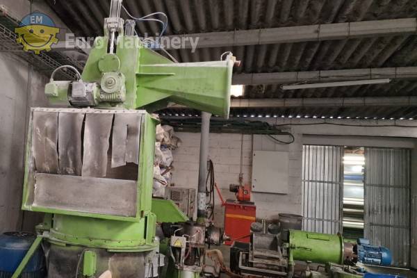 Linia do recyklingu materiałów PE EREMA RGA 100 ze ślimakiem 100 mm i wydajnością do 120 kg/godz. Obejmuje zestaw aglomerator-wytłaczarka, system granulacji na gorąco i akcesoria. Marka i model: EREMA RGA 100 Materiał, który może być przetwarzany: PE Średnica śruby: 100 mm 24 L/D Wydajność: Do 120 kg/h, w zależności od rodzaju materiału i szybkości podawania. Brak odgazowania Typ zbiornika wytłaczarki: Aglomerator/kompaktor tnący – Kombinacja wytłaczarek System granulowania: Granulacja na gorąco na matrycy – System koła wodnego Przystawki i akcesoria:- Wanna