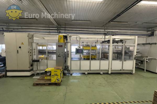 Używana ciśnieniowa linia do termoformowania próżniowego (OMG OMF/PVE 50-PN-M) do przetwarzania tworzyw sztucznych, takich jak PS, PET, PP i PVC. Maszyna obejmuje stacje formowania, cięcia i układania w stosy. Typ: Termoformowanie ciśnieniowo-próżniowe Marka: OMG OMF/PVE 50-PN-M- Przetwarzane materiały: PS, PVC, PET, PP, EPS