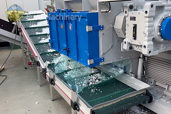 Profesjonalny rozdrabniacz jednowałowy o wydajności 800-1000 kg/h ze 102 precyzyjnymi nożami rotora, idealny do recyklingu folii PE i redukcji materiału. Kompletny system obejmuje przenośnik załadowczy, wykrywacz metalu i przenośnik wyładowczy do integracji produkcji pod klucz.